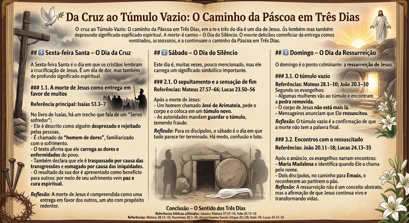 A Páscoa cristã recorda três dias centrais na fé cristã: sexta-feira (crucificação), sábado (silêncio e sepultamento) e domingo (ressurreição).